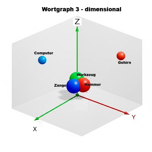 Beispiel eines 3- dimensionalen Wortgrafen zum Beispiel Werkzeug. Erklärung: Hammer und Zange sind sehr nahe bei Werkzeug, da sie ja unter dem Ober-Begriff Werkzeug abgelegt sind. Die Begriffe Gehirn und Computer sind weiter Weg ( in dieser Darstellung, vielleicht hat aber ein Mensch Computer und Gehirn auch als Werkzeuge oder den Werkzeugen verwandt näher an Werkzeug im Netzwerk gespeichert.